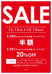 スタイル別府店からウィンターセールのご案内です❣️【期間】12月12日(金)~12月15日(月)の4日間【SALE内容】 2000円以下のお洋服とキッズアイテムが半額‼️2001円以上のお洋服とキッズアイテムが20%OF […]